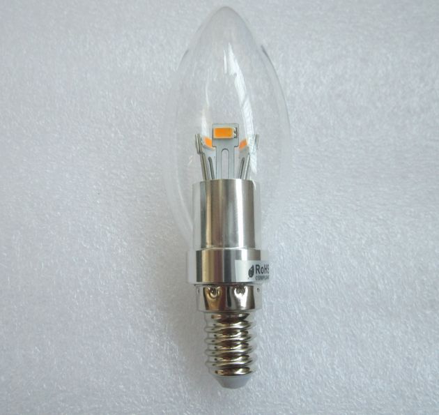 3W LED candle bulb3W/4W LED bulb for chandelier(Clear/frosted/Milky glass)E14/E17/E26/E27/B221 Sparkle and Flame light effects.2 Only 3Watts but identical to 25Watts incandescent bulbs.3 2000hrs lifespan, CETechnical ParametersProduct Number: LMB-3W-12BE14Power: 3WLED Source: SAMSUNG SMD5630luminous flux: 110-130LMColor Temp: 2700K/3000K/6500KGlass Color Clear, Frosted, MilkyPF >0.9Ra: 0.75Voltage: 100-240VACBase E12/E14/E17/E26/E27/B15/B22Main Material Aluminum & GlassLifespan 20000hrsAdvantages:1. Unique in global market!2. Used in Chandeliers and very beautiful!3. Sparkle and Flame light effects.4. Only 3Watts but identical to 25Watts incandescent bulbs.5. Little heat,little power,and more comfortable!