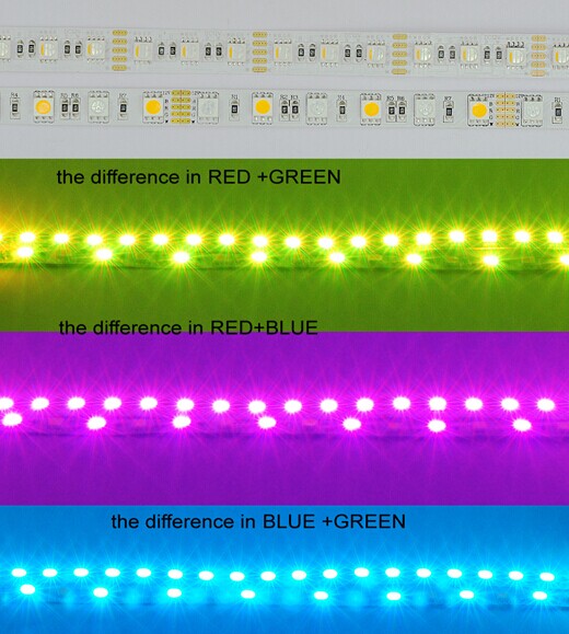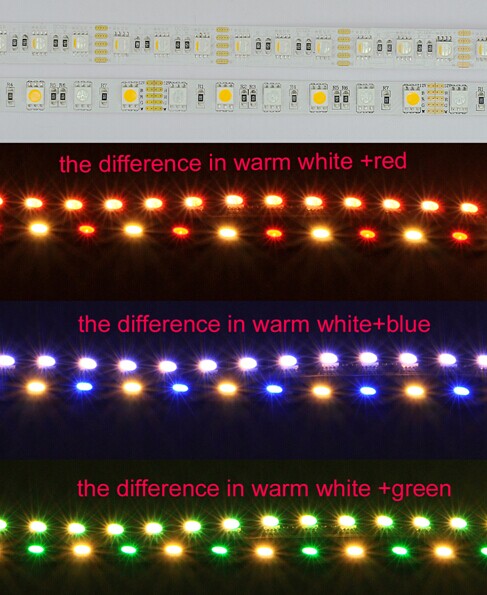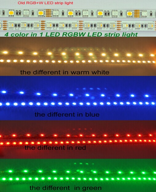 - 4-in-1 RGBW SMD5050 LED Flexible Strip Lights, 4 color in 1 LED SourceLED Source: High Brightness SMD5050 LED/Epistar chipLED quantity per meter: 60LED/M, 72LED/M, 84LED/MInput Voltage: DC12V/24VLight color: RGB+Warm White, RGB+ Natural White, RGB+ Cool WhiteLED Source: 4 in1 LEDs, RGBW is in one LEDsPCB Color: White/YellowBeam angle:120°Protect Range: IP44(non-waterproof)IP65(Crystal Epoxy Waterproof)IP68(Crystal Epoxy and glue irrigation Waterproof)Life Span: 50,000 hoursHigh brightness SMD5050 RGBW LED Strip lightsRGBW Flexible LED Strip Features:1. 4 in 1 LED Source, RGBW color is in one LEDs.2. With one LED Strips, you can not only enjoy all the features of RGB strips, but white LED Strips as well3. Warm White, Nature White, Pure White is up to your preference4. Can be cutted by 3LEDs(12V) or 6LEDs(24V)5. With 3M adhesive tape back, easy for installationApplications:1, Household, office,restaurant and hotel decoration2, Commercial lighting, back lights and advertisements3, Architectural and cove lighting4, Shopping mall stairway and hallway accent lightingThe difference of our new RGBW LED strip and the old RGBW LED strip1. LED chipNew RGBW LED is red,green,blue and white color all in 1 LEDs, the old RGBW LED is 1pcs RGB LED +1 pcs white LED.2.The single color lighting effect of 60pcs LED/ 1 meterNew RGBW LED is all 60pcs LED lighting, the old RGBW LED is only 30pcs LED lighting3. The mixed color lighting effect of 60pcs LED/1 meters in RGBNew RGBW LED is all 60pcs LED lighting, the old RGBW LED is only 30pcs LED lighting4. the mixed color lighting effect of 60pcs LED/1 meters in RGB+Wwarm white+red , warm white+blue,warm white+green